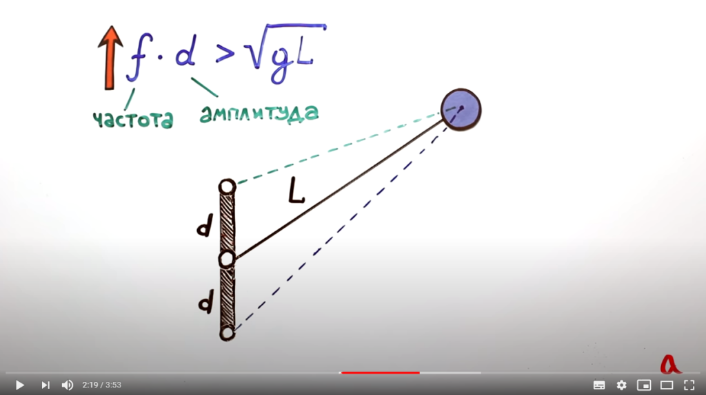 А эта формула описывает взаимосвязь частоты вибраций подвеса, амплитуды колебаний и длины жесткого подвеса.