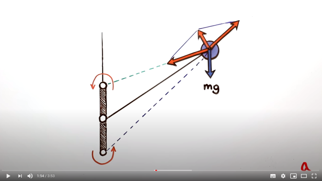 Давайте посмотрим, какие силы действуют на «маятник Капицы». После прохождения верхней мертвой точки подвес маятника начинает тянуть грузик вниз. После прохождения нижней мертвой точки подвес толкает грузик вверх. Так как углы вежду векторами сил в верхней и нижней точке разные, то сумма их векторов дает силу, направленную к оси вертикальных колебаний маятника. Если эта сила больше силы тяжести, то верхнее положение маятника становится устойчивым.