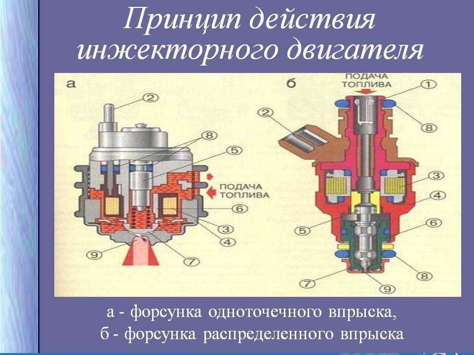 Форсунки подают горючую смесь непосредственно в цилиндры, такой вид оснащения двигателя бензином используется практически во всех современных силовых агрегатах. За поддержание уровня топлива, наращённого бензонасосом в топливо проводе, отвечает обратный клапан. Устройство и разница форсунок состоит из электромагнитного клапана, пружины, а также распыляющей системы.