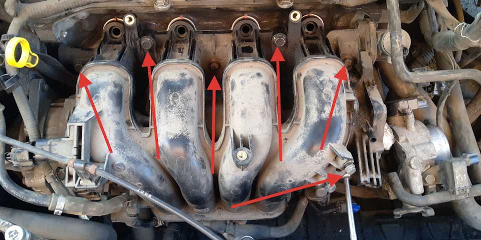 - Откручиваем шесть болтов — крепления выпускного коллектора;