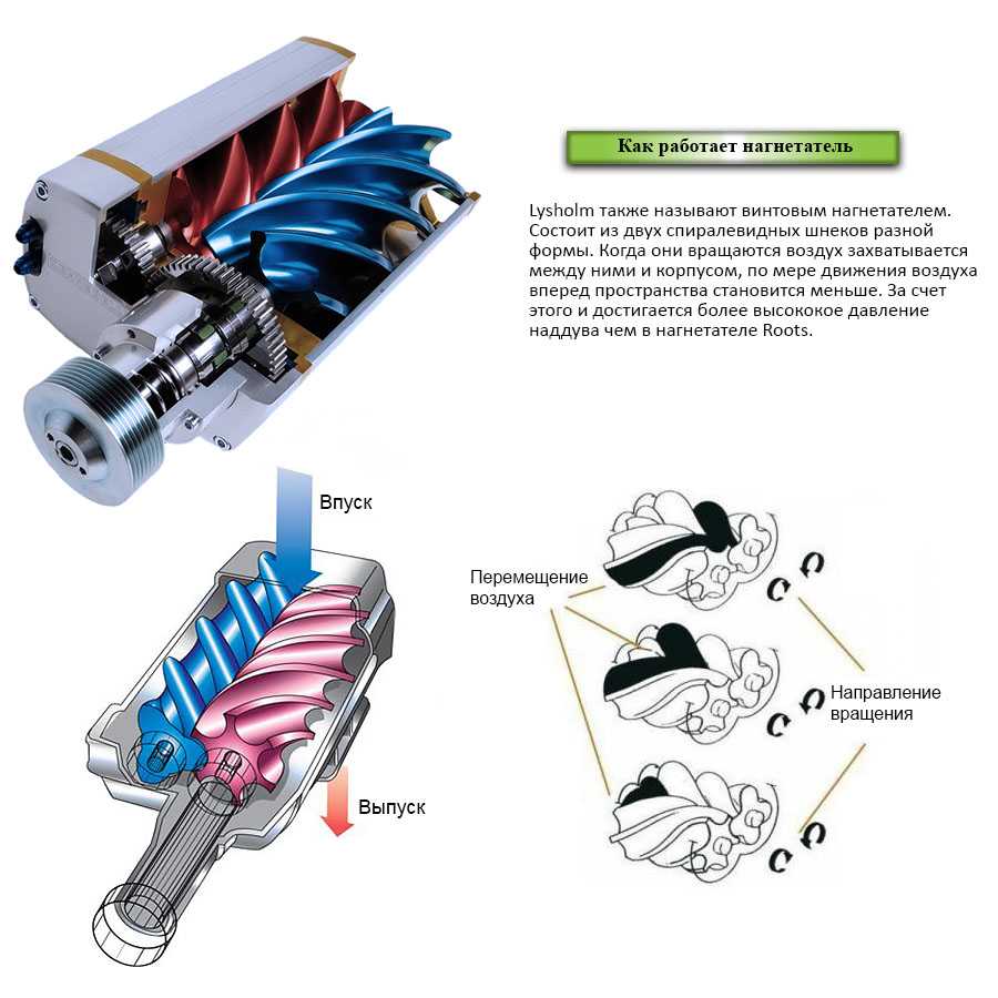 Наддув двигателя типа Lysholm конструктивно схож с Roots, но у него вместо роторов используются спиралевидные шнеки (как в мясорубке). В такой конструкции создание давления происходит уже в самом нагнетателе, а не на выходе. Суть проста – воздух захватывается шнеками, сжимается в процессе транспортировки шнеками от входного канала на выходной и затем выталкивается. За счет спиралевидной формы процесс подачи воздуха идет непрерывно, поэтому никакой пульсации нет. Такой нагнетатель обеспечивает создание большего давления, чем конструкция Roots, работает бесшумно и на всех режимах мотора.