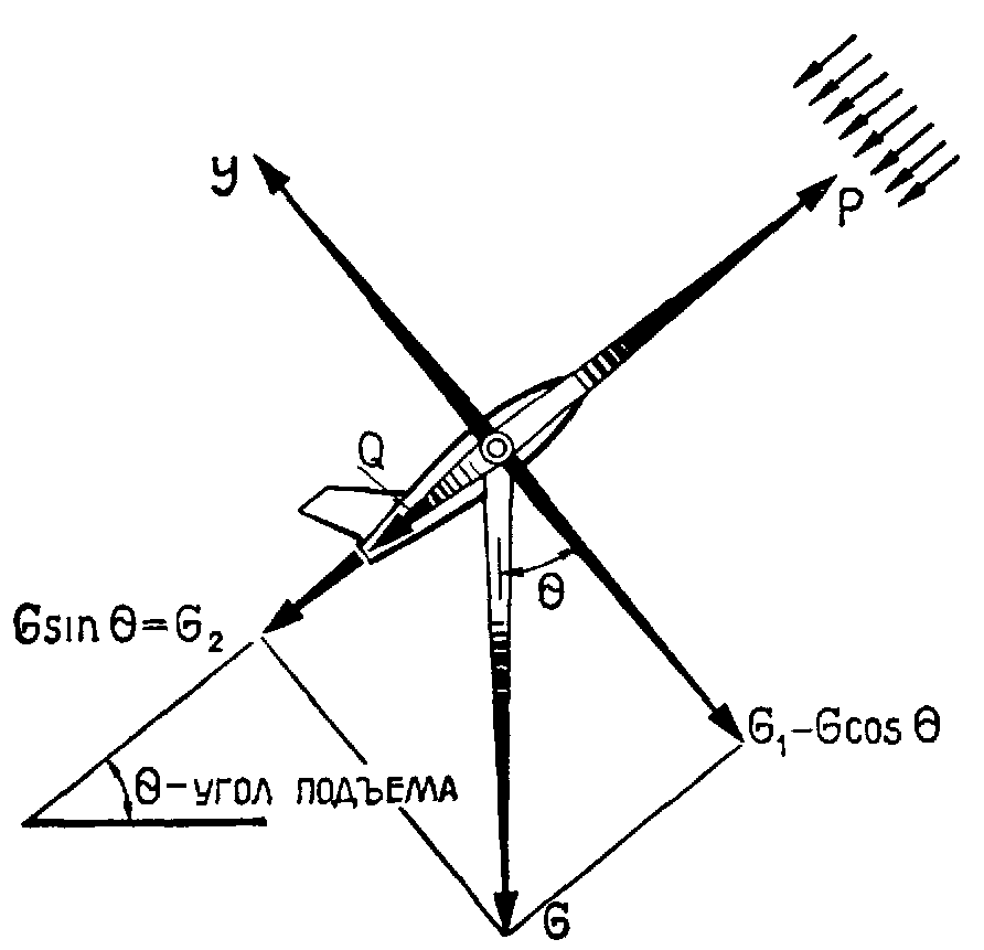 Vгп – cosθТяга, потребная для подъема. Тяга, необходимая при подъеме самолета на данном угле атаки, называется потребной тягой для подъема.РG2Этот вывод подтверждают кривые Жуковского (Рисунок6.2).Мощность, потребная для подъема. Мощность, необходимая для обеспечения подъема самолета на данном угле атаки, называется потребной мощностью подъема.Nанализа кривых Жуковского следуетN.Угол и вертикальная скорость подъемаманевренные свойстваУгол подъемаРисунок 7.2 Треугольник скоростей при наборе высотыР= G ∙ sin, sin=Р/G.Рmax
