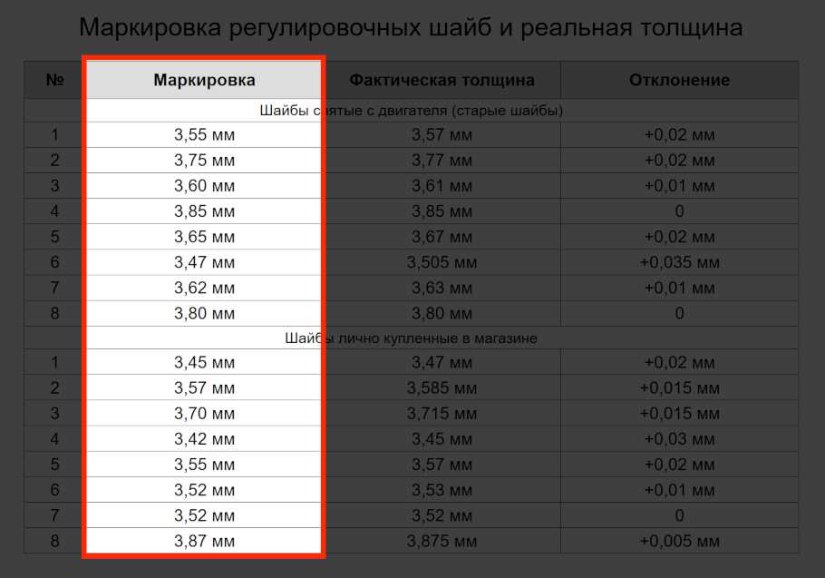 Идем далее. В колонке «Маркировка» я записал номинальный размер регулировочных шайб, который указан на шайбе.