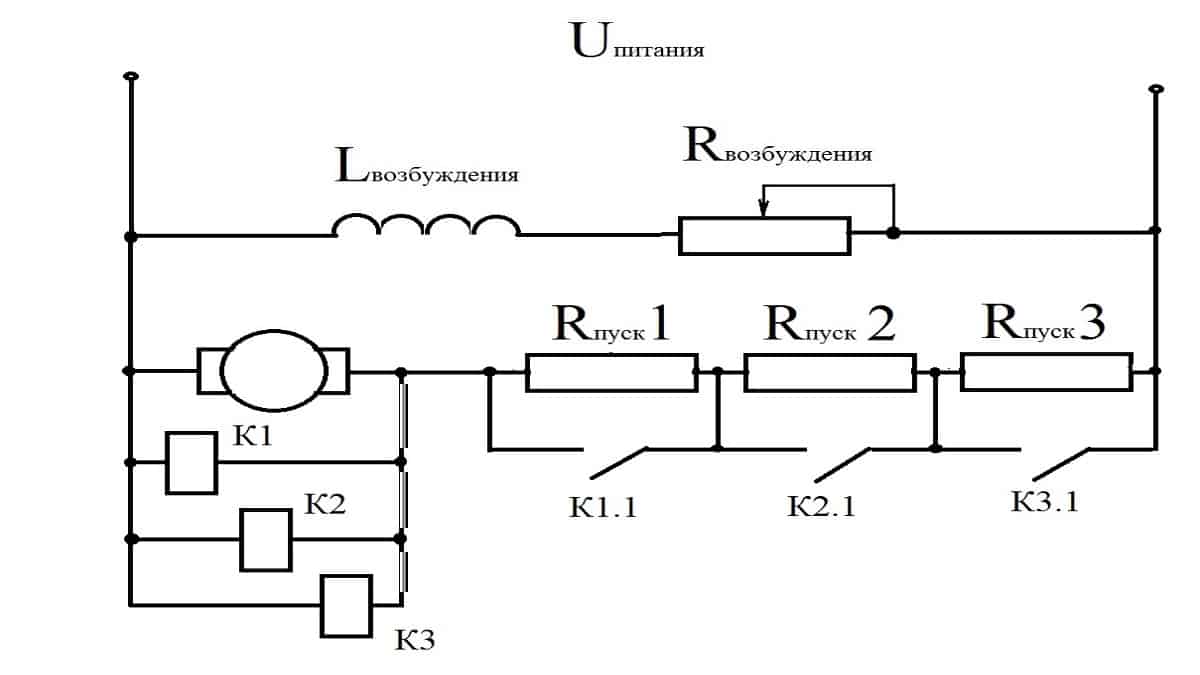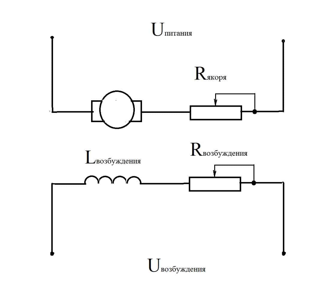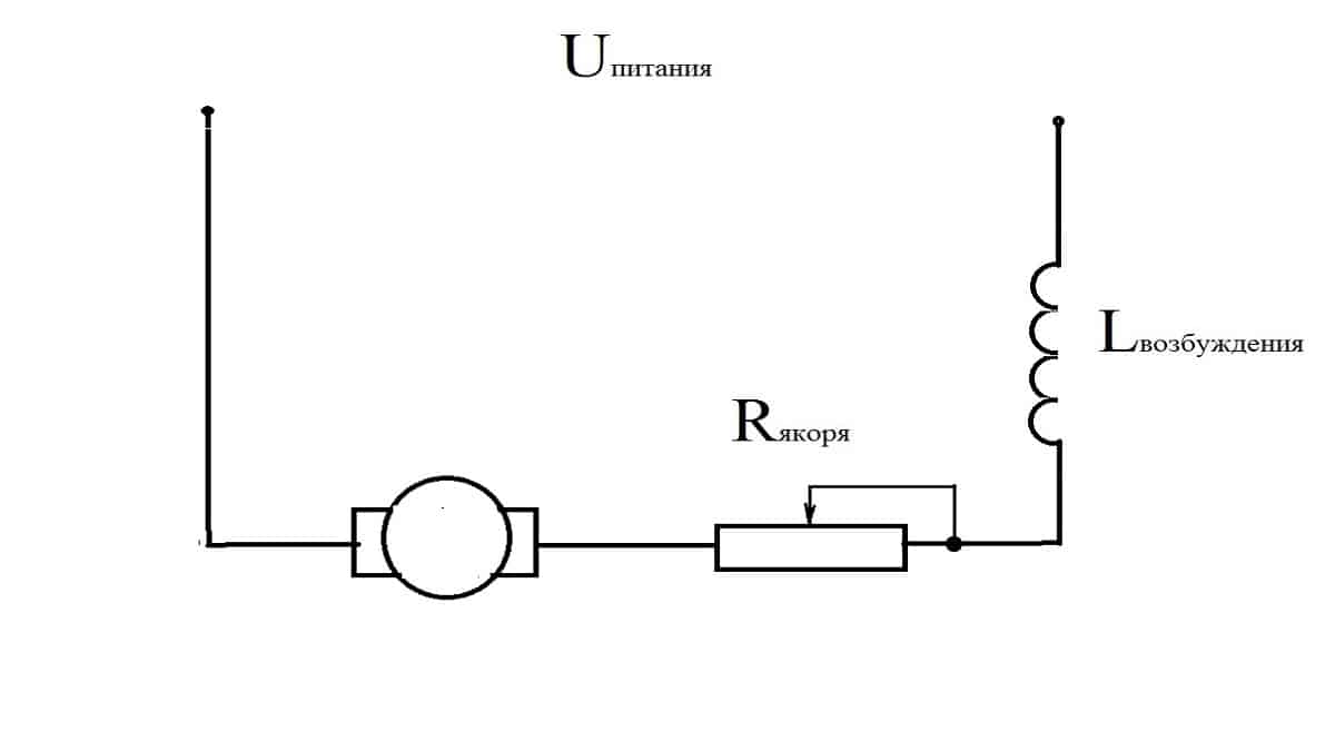 Рис. 3. Запуск ДПТ с последовательным возбуждением На рисунке выше приведена принципиальная схема подключения электродвигателя с последовательным возбуждением. Ее отличительная особенность заключается в последовательном соединении катушки возбуждения Lвозбуждения и непосредственно мотора, переменное сопротивление Rякоря также вводится последовательно.