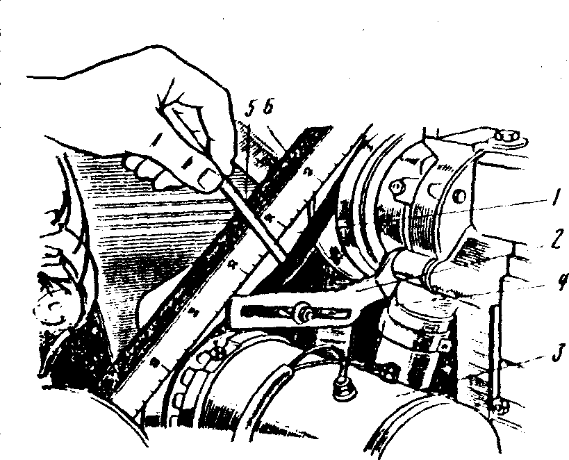 Проверка натяжения ремня привода вентилятора: 1 – ремень; 2 – планка; 3 – генератор; 4 – крепление генератора;5 – линейка; 6 – вспомогательная линейка.