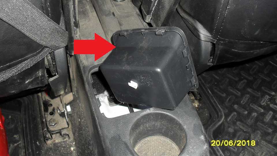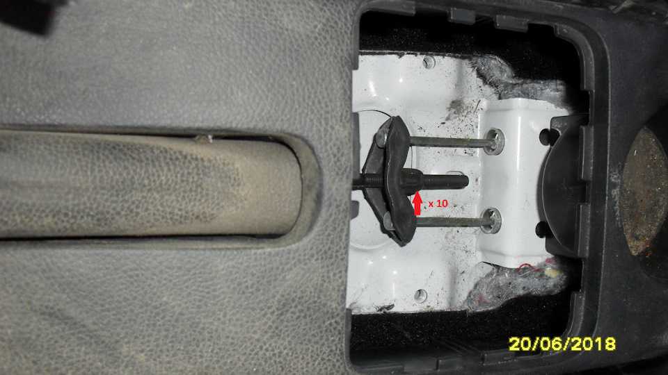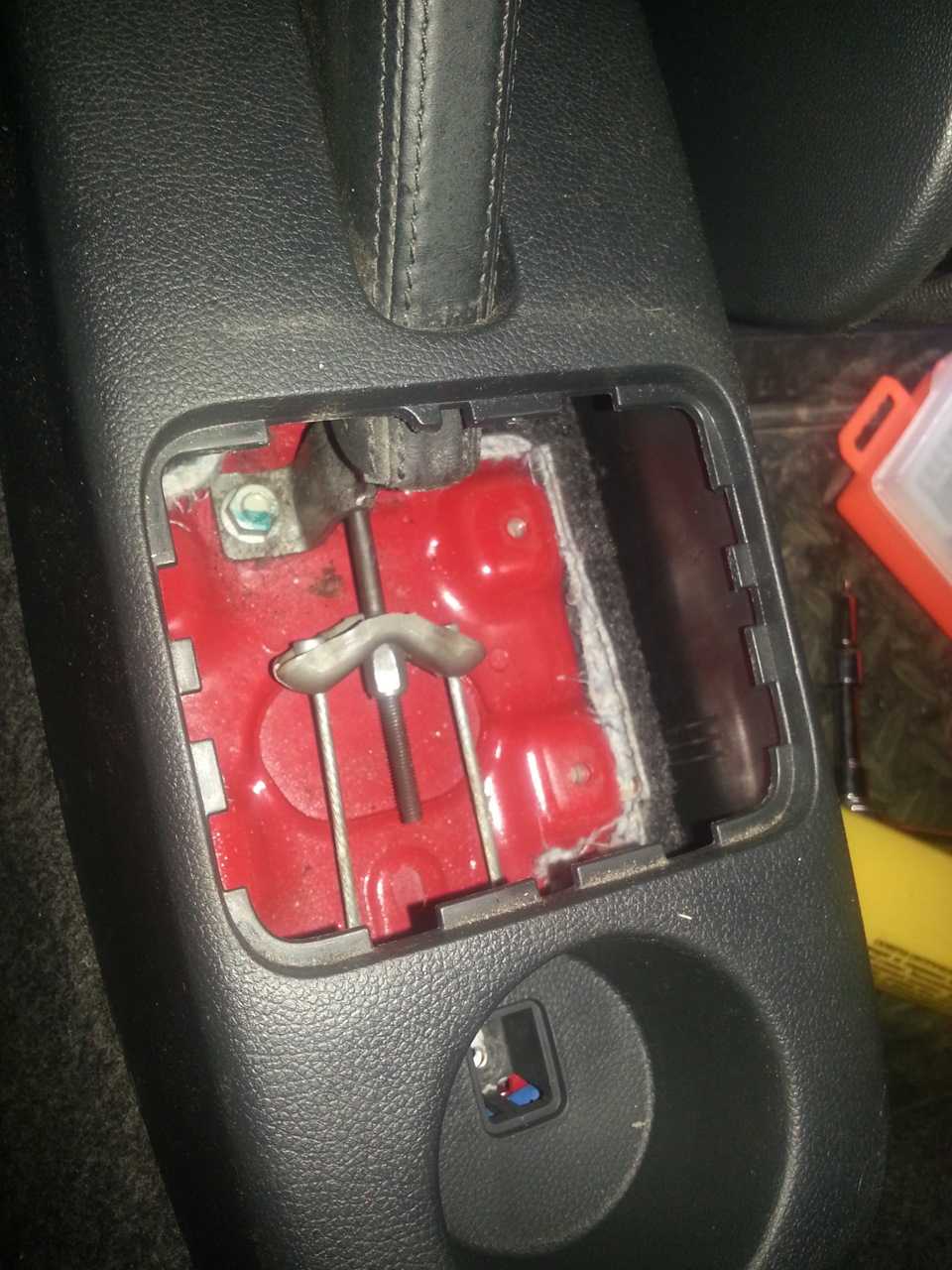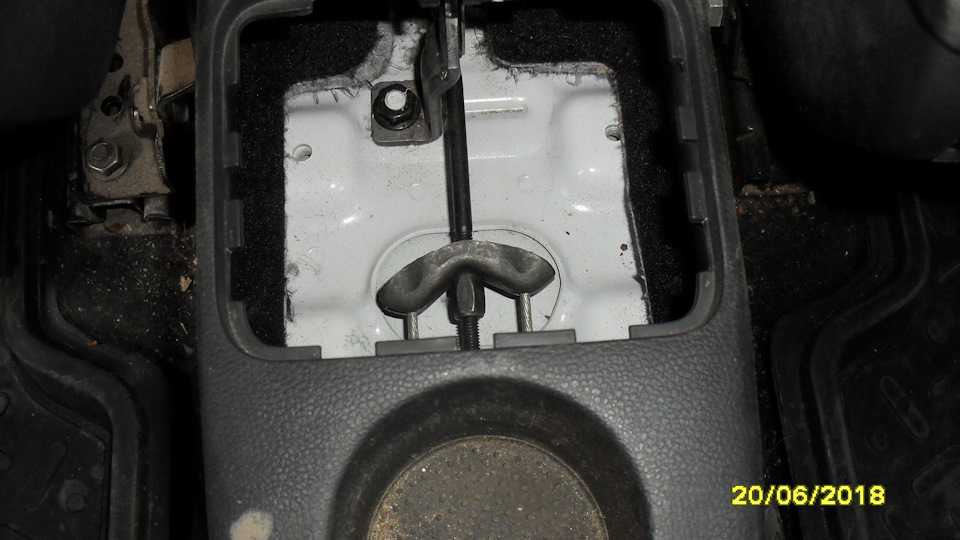 Регулировочная гайка троса находится под подлокотником между передними креслами, и его необходимо снять.