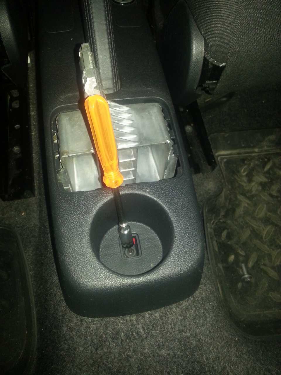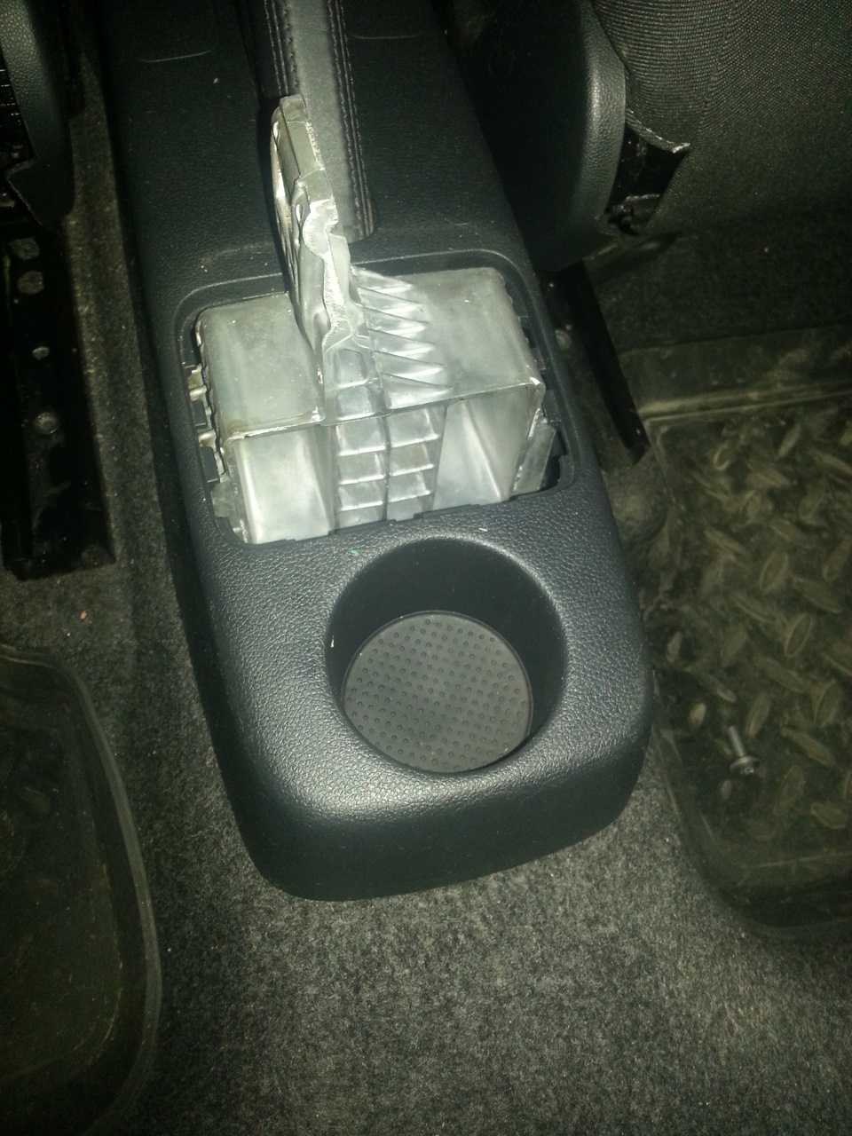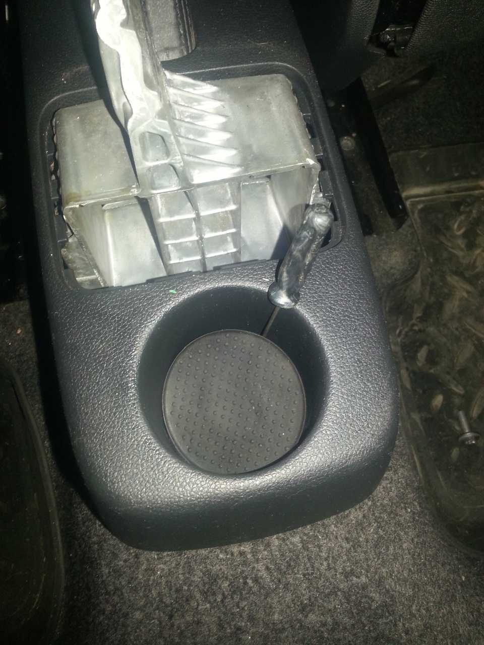 После этого нам нужно вынуть из отсека для пепельницы резиновую вставку. Сделать это легко, достаточно на нее просто надавить (там отверстие для болта прям посередине), она сместится, и подсовывая нашу отвертку, мы с легкостью её вынимаем.