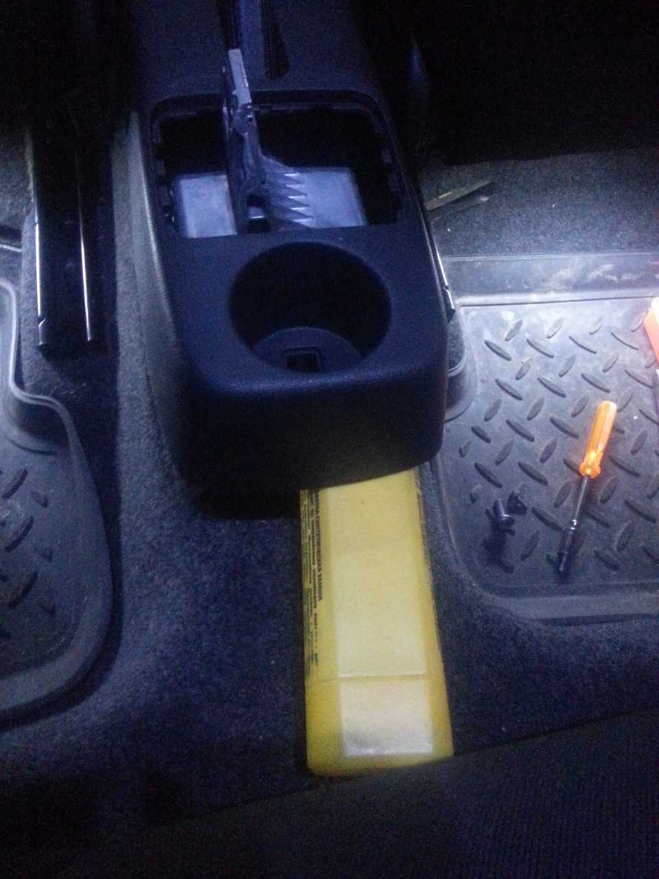 Теперь самое интересное, поднимаем ручник максимально вверх, и поднимая центральную консоль, подкладываем под нее что-то, дабы она держалась и нам было удобно откручивать болты, держащие кронштейн, их 4 штуки. К слову, на заводе специально подрезали ковролин, чтобы было удобно устанавливать / снимать подлокотник.