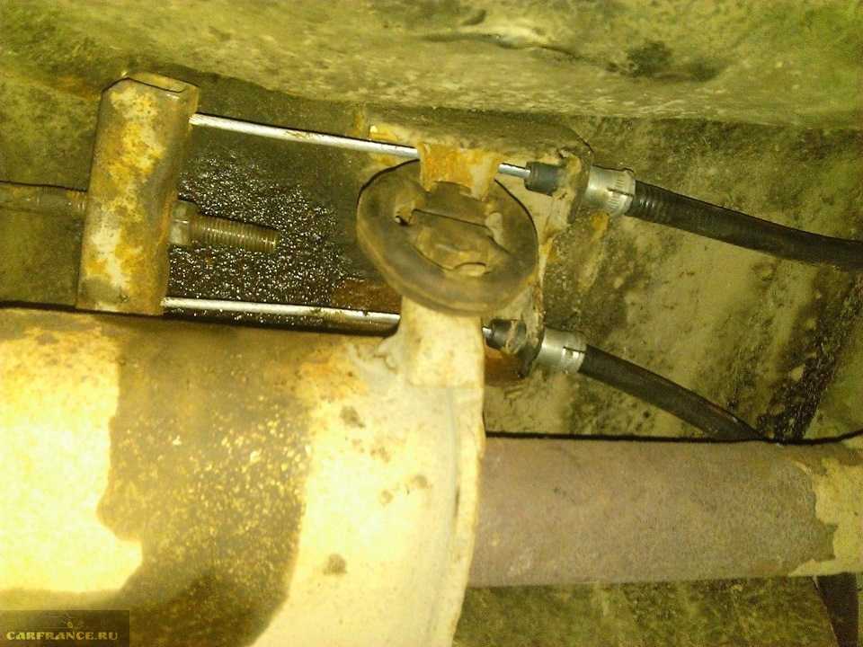 4. После проделанной регулировки собираем колеса в обратном порядке. Переходим к ручнику. На фото видно, что теперь тросики находятся симметрично относительно друг друга, думаю, так оно и должно быть.