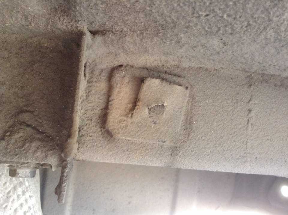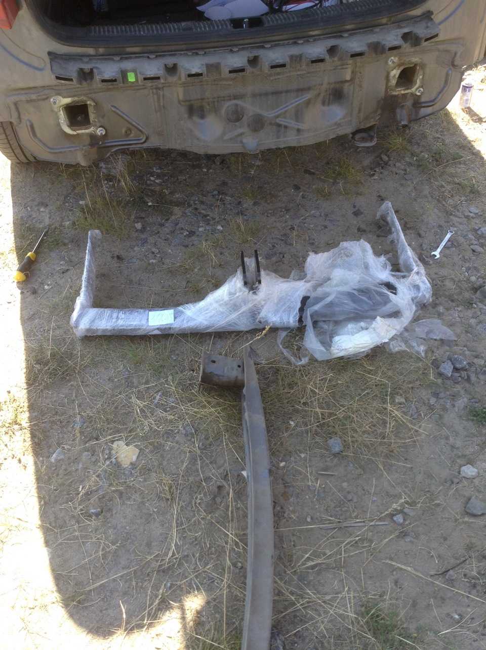 Откручиваем заводской усилитель бампера и ползём под днище, на лонжеронах видим заглушки на отверстиях которые понадобятся чтоб, собственно, прикрутить фаркоп, выковыриваем их отвёрткой