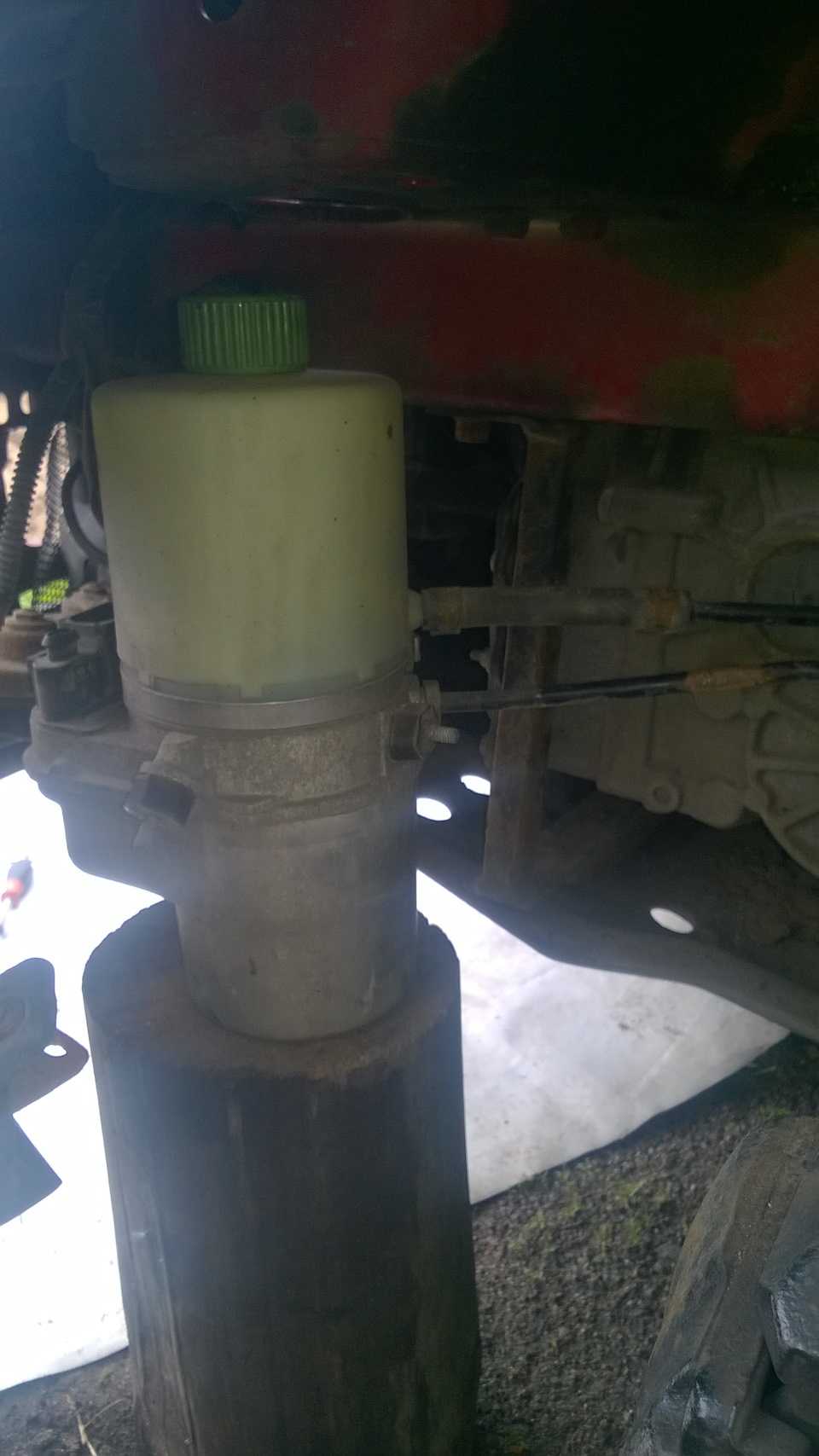 6. Я подставил под ЭГУР пенек для удобства и затем уже скручивал трубки. Первым снимаем возвратный трубопровод. Он подключен к насосу резиновым патрубком. Затем скручиваем подающий.