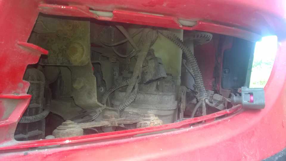 2. Поддомкрачиваем перед авто и вывешиваем оба колеса. Затем снимаем водительское колесо, локер и переднюю левую туманку (или заглушку, у кого что).