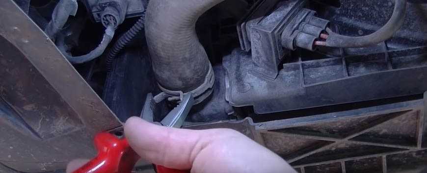 3. На нижнем патрубке радиатора сжимаем хомут пассатижами и уводим в сторону.