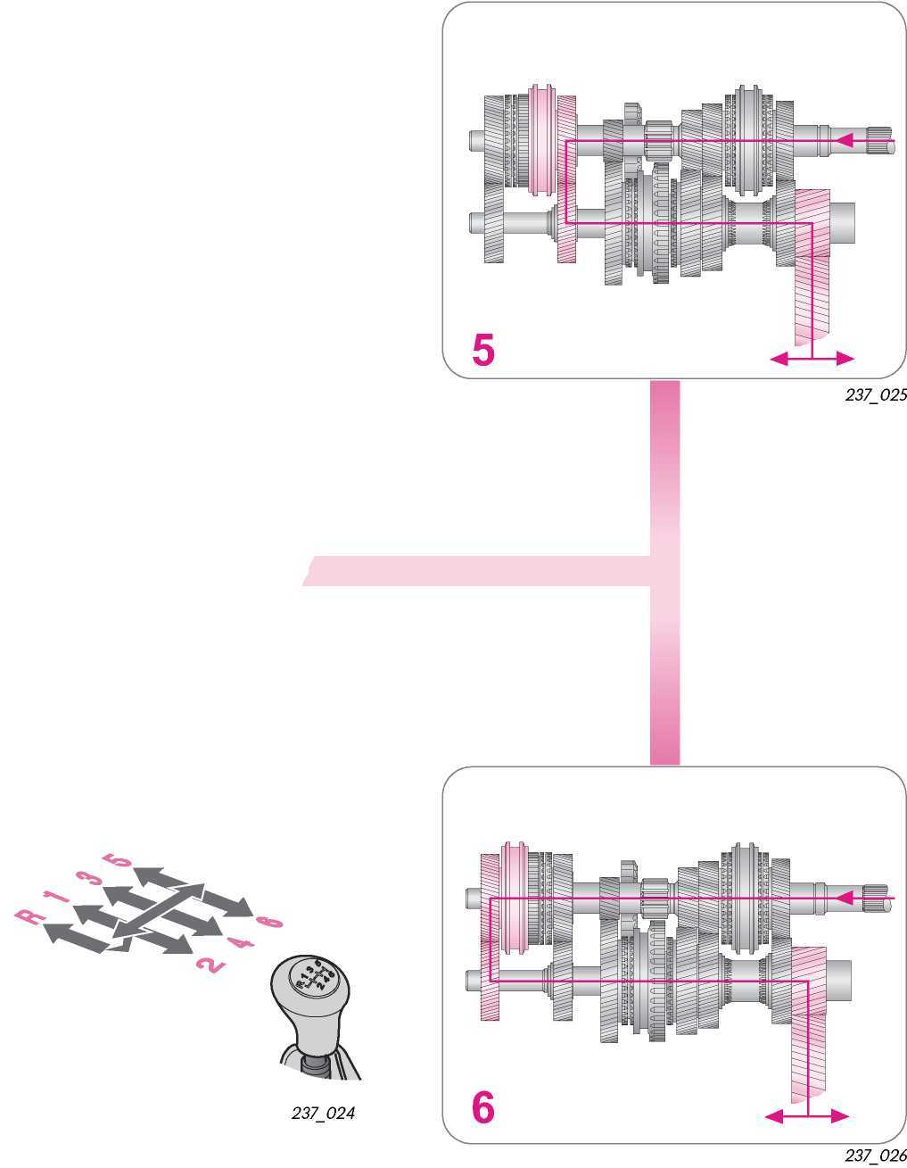 В соответствии с включенной передачей крутящий момент через ступицу синхронизатора для 5-ой/6-ой передач и соответствующую пару шестерен передается на вторичный вал и далее на ведомую шестерню главной передачи с дифференциалом.