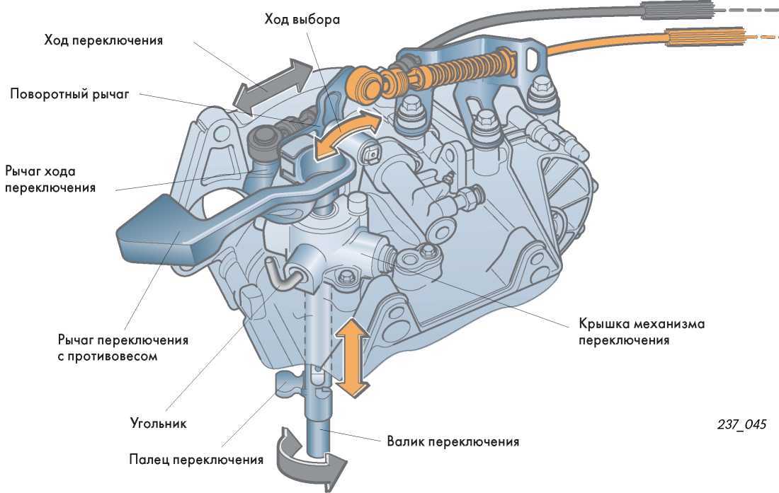 Механизм (поворотный рычаг и рычаг хода переключения) преобразуют перемещение этих двух тросов в осевое и вращательное перемещение валика переключения.