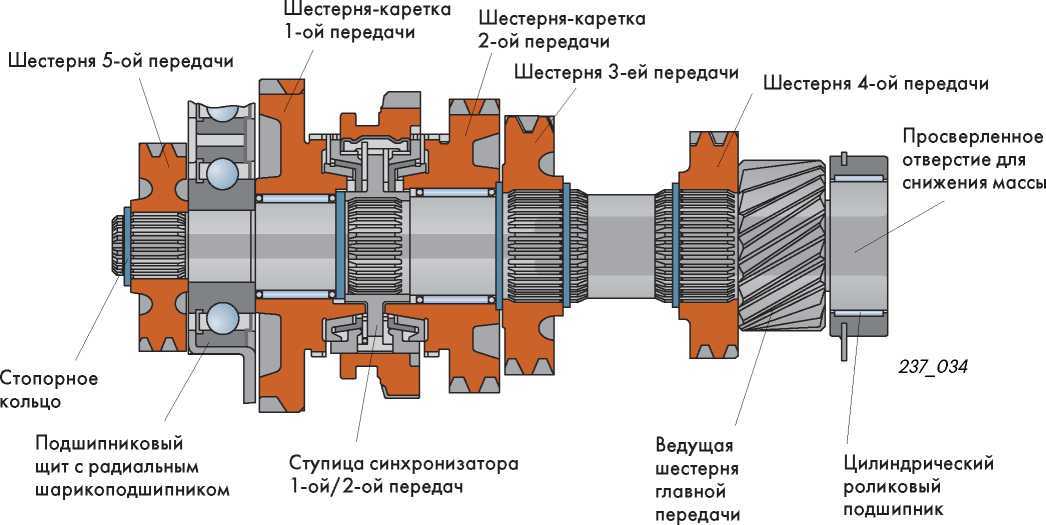 Шестерни 3-ей, 4-ой и 5-ой передач и ступица синхронизаторов 1-ой/2-ой жестко закреплены на шлицах вторичного вала.