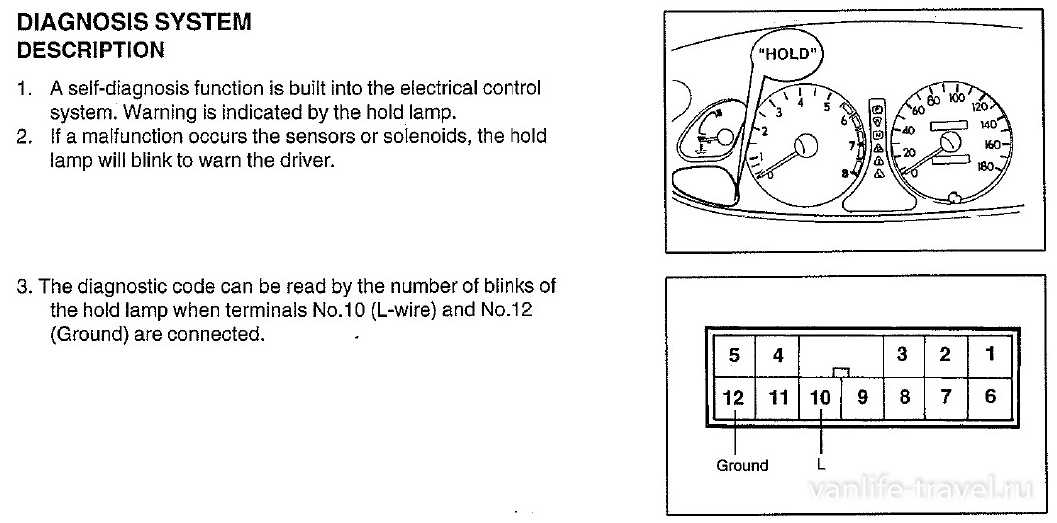 Аналогично предыдущему случаю замыкаем между собой пины 10 и 12 диагностического разъема (тем самым сажая L-line на массу), и считываем код неисправности по миганию лампы HOLD