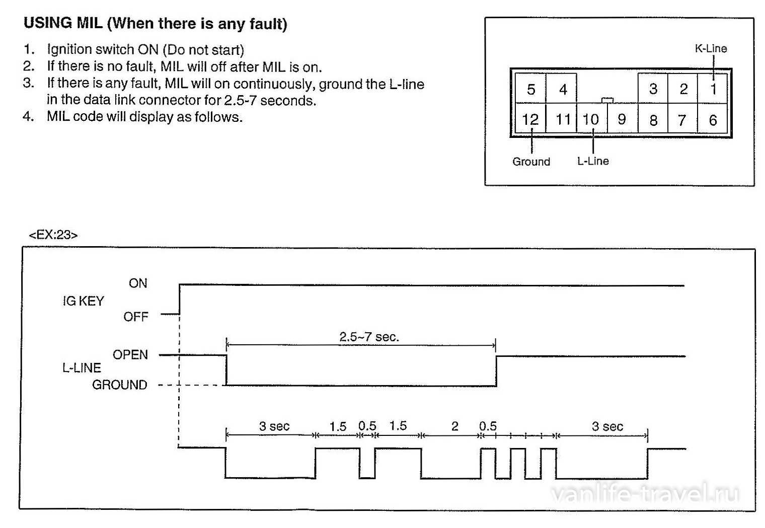 Важно: после замыкания L-линии на массу лампа Check Engine сначала мигнет один или два раза (сведения в разных руководствах по ремонту отличаются), и уже потом начнет выдавать код ошибки, который затем будет повторяться до тех пор, пока L-линия не будет отсоединена от массы. Коды неисправностей/ошибок (engine DTC-codes) бензинового двигателя G4CS: