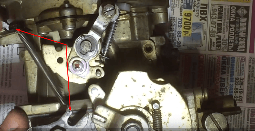 Остаётся поставить рычаг, зафиксировать его, как предусмотрено конструкцией. И последний штрих: в проделанные отверстия вдеть концы новой пружины. Она будет играть роль доводчика, тогда работа дроссельной заслонки станет ещё более эффективной.