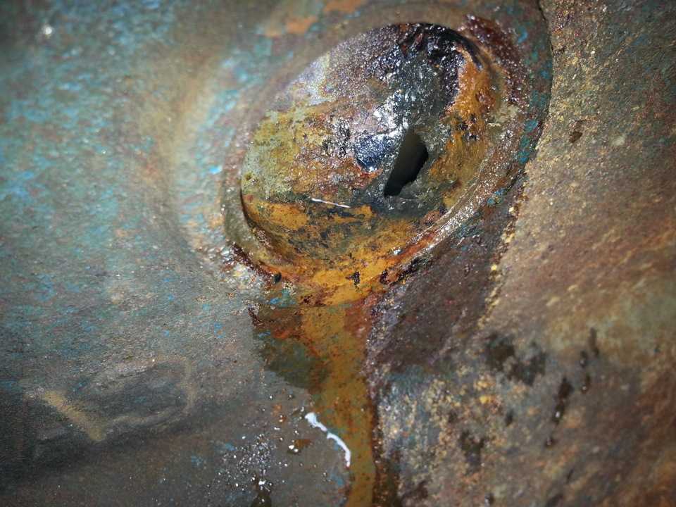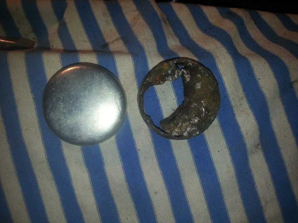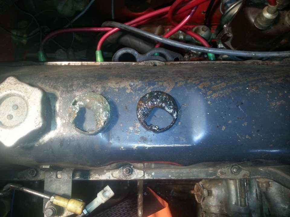 С помощью наждачной шкурки края отверстия на блоке цилиндров зачищаются от ржавчины. Для более качественной герметичности края у новой заглушки перед установкой в гнездо можно смазать герметиком. Разницу между новой и старой заглушкой хорошо видно на фото.