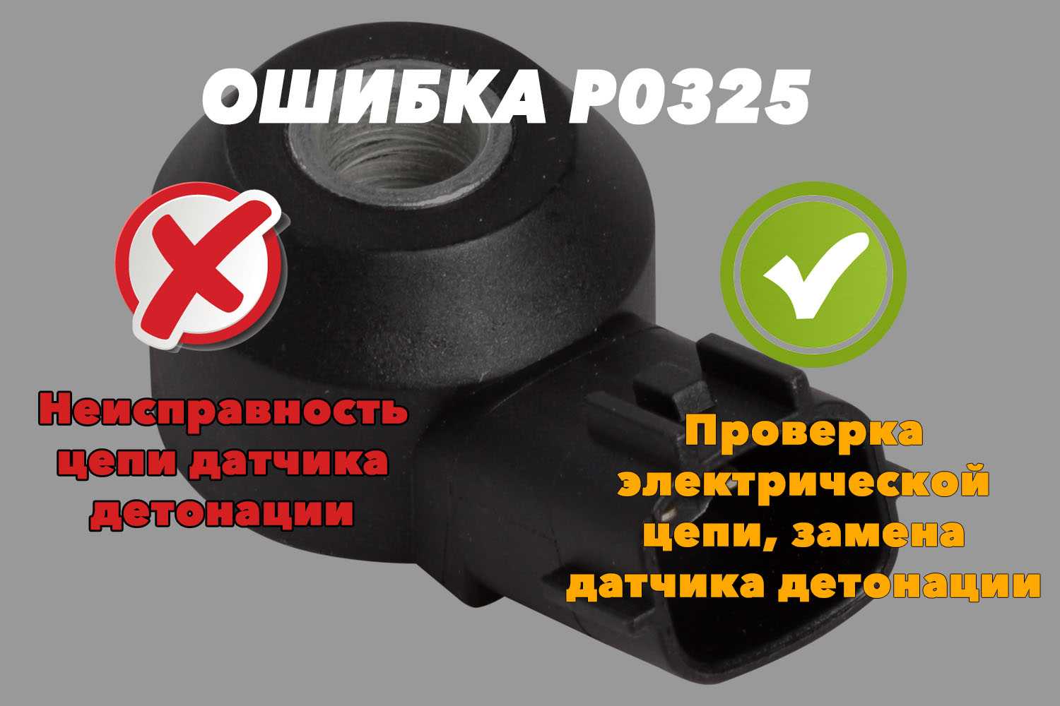 Все бензиновые автомобили с инжекторной системой питания оснащены датчиком детонации топлива, расположенного, как правило, между цилиндрами на самом блоке. Сам по себе датчик достаточно надежен и его внутренние компоненты ломаются в редких случаях. А вот разрывы цепи, о чем свидетельствует ошибка P0325, случаются действительно часто. В большинстве случаев хватает одной проверки электрической части – клемм, проводки, – замеряются основные рабочие характеристики.