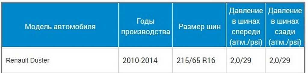 Таблица с нормативным давлением в шинах авто Рено Дастер