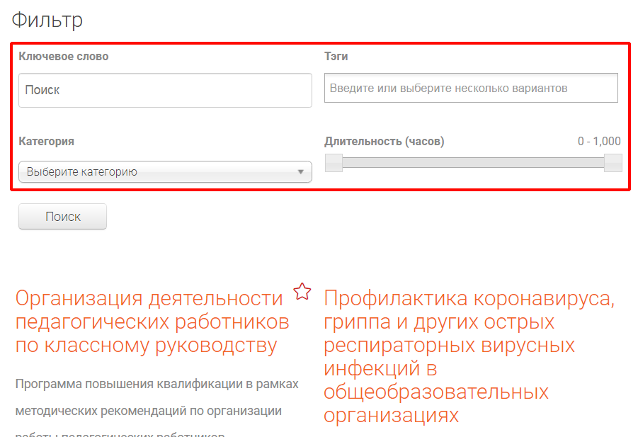 На открывшейся странице Вы можете воспользоваться фильтром для поиска подходящего направления обучения, выбрать программу повышения квалификации или переподготовки. Вы также можете не заполнять фильтр, а ознакомиться с актуальным списком курсов ниже.