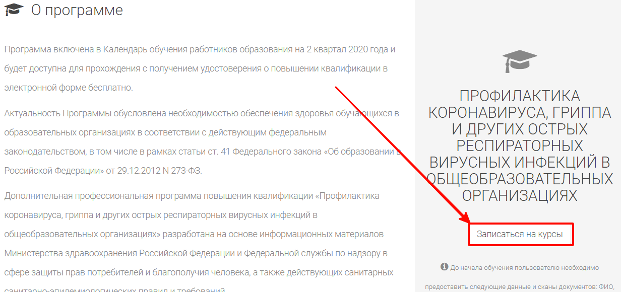 Если у Вас полностью заполнен профиль, в нём указаны диплом, паспорт и отправлены сканы документов, то Вы можете записаться на выбранные курсы. Для этого нужно в правой части страницы кликнуть по соответствующей кнопке.
