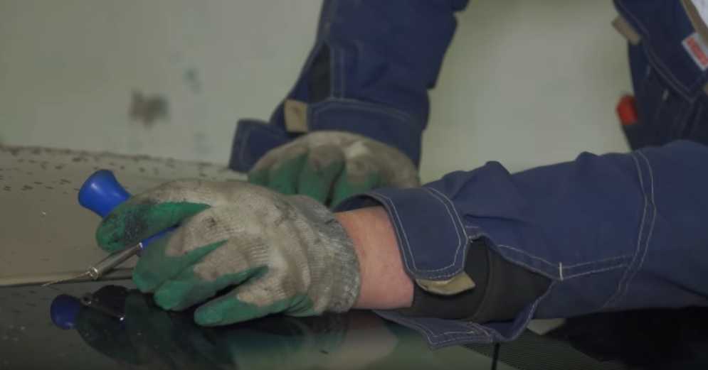разрезать и разобрать старое стекло удобнее с помощником. В кабину втягивается трос, чтобы удалить старый герметик, это потребует значительных усилий. В цехе работают два мастера, время работы до 15 минут. Этапы замены: демонтаж старой детали, подготовка, вклейка нового стекла.