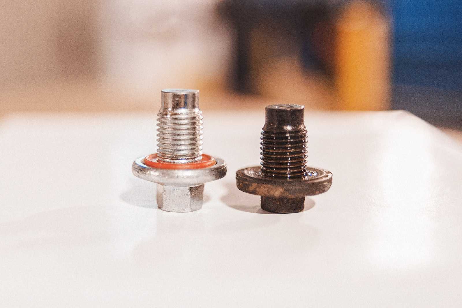 Давайте взглянем на сливную пробку, незаслуженно забытом бойце масляного фронта. Резиновый уплотнитель на заводской пробке не вечный, со временем он морально устаёт и начинает пропускать масло. Не забываем, что пробка тянется с моментом 28 Н·м, что в свою очередь печально сказывается на резьбе как на пробке, так и внутри поддона. Есть два простых варианта решения: купить новую оригинальную пробку или поставить человеческую.