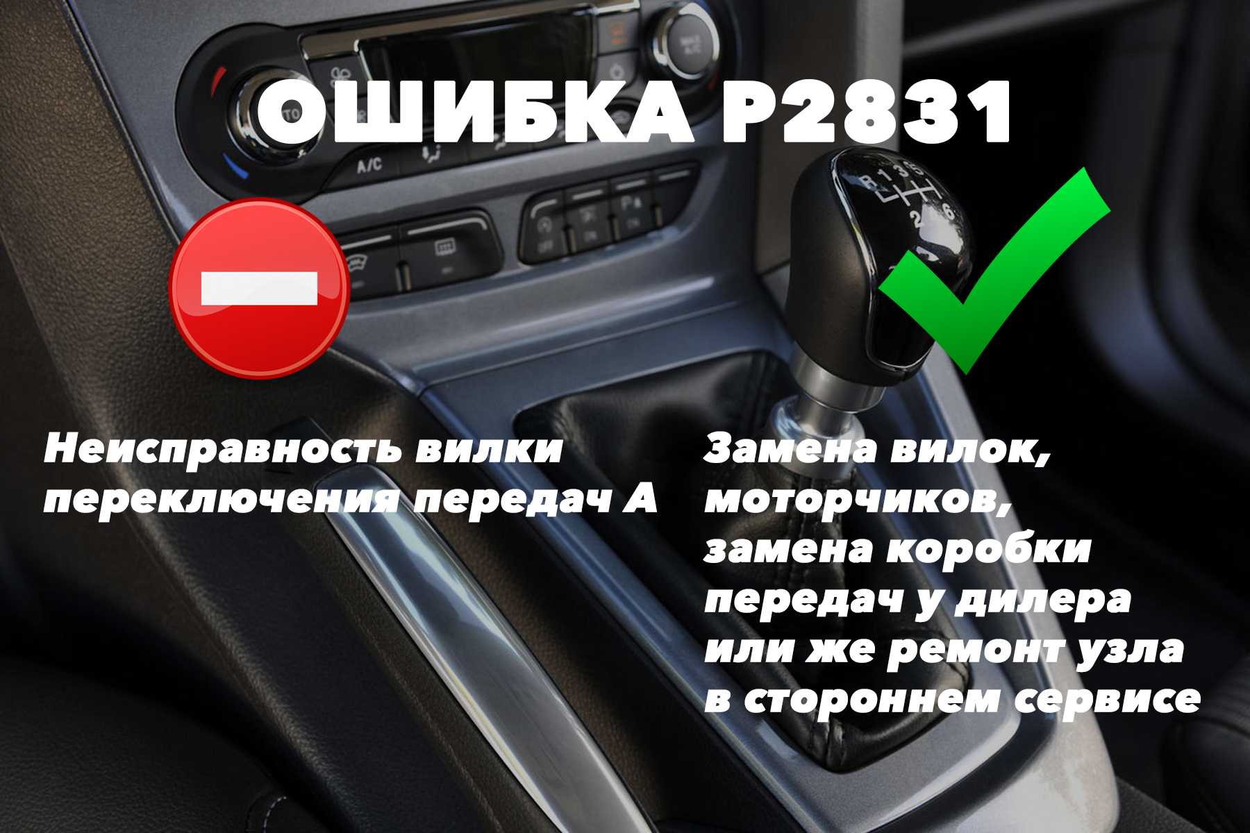 Дословно расшифровка P2831 на Ford Focus 3 выглядит так – неисправность вилки переключения передач «А». Достаточно сложная поломка, которая определенно требует квалифицированного подхода. Решение сводится к поездке к официальному дилеру, задача которого тщательно проверить все элементы трансмиссии и точно определить причину недуга. В случае с P2831 обычно меняют местами моторчики управления переключение передач. Подобную задачу можно выполнить и самостоятельно, так как эти два механизма находятся сверху КПП. Если после смены положения ошибка переходит на другую вилку, то замене подлежит вилка и управляющий моторчик. В идеале меняются сразу две вилки, высока вероятность, что в ближайшее время выйдет из строя и вторая. Не будет лишней замена изношенного сцепления (пробег свыше 80 000 км).