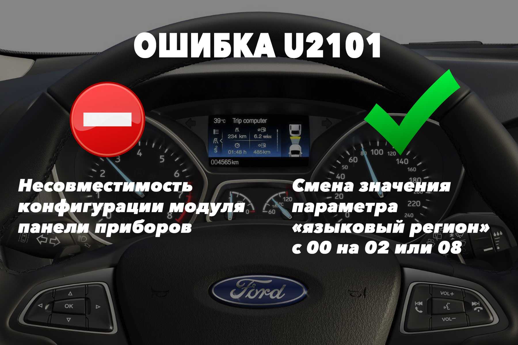 С этой ошибкой сталкивался каждый, кто менял приборную панель. Чтобы устранить U2101, нужно изменить параметры в центральном конфиге. На моделях Форд Фокус 3 со старыми приборными панелями по типу РП32 и РП7 значение параметра «языковый регион» установлено 00 – не определено. После физической смены панели или перепрошивки модуль требует другое значение параметра, поэтому в памяти блока ЭБУ появляется ошибка U2101. Для её устранения необходимо изменить значение с 00 на 02 или 08 – Европа и Россия соответственно. В некоторых автомобилях проблема уходит и после установления 02, и после 08 – всё зависит от комплектации и года выпуска авто.